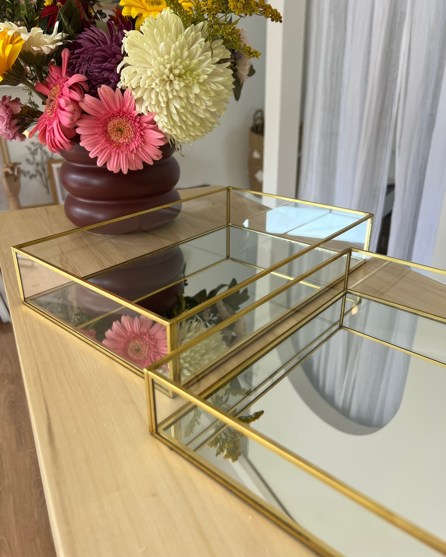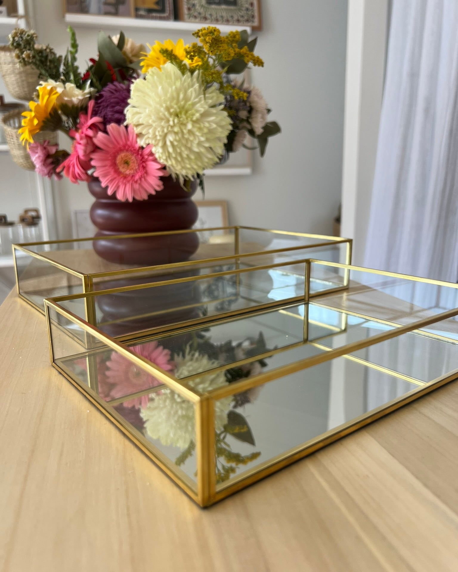 Bandeja decorativa de vidrio espejado con estructura metálica dorada.