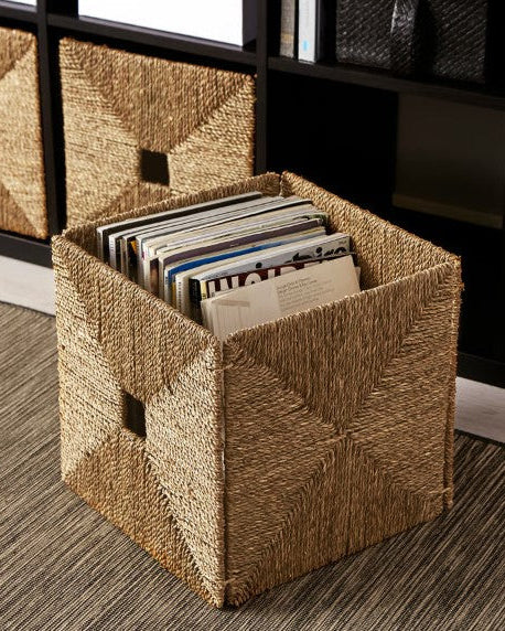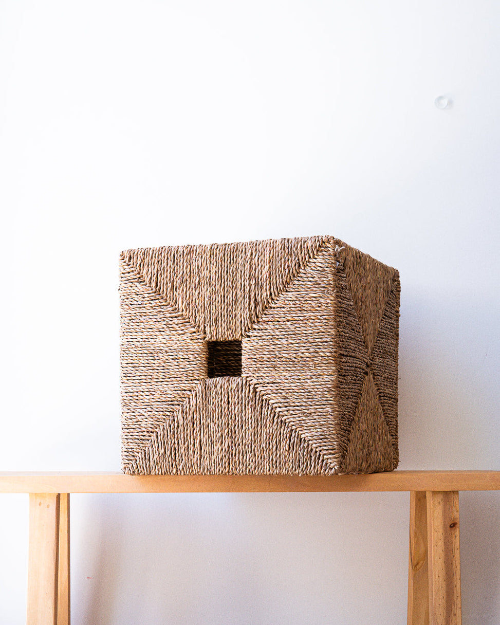 La estructura de acero se ha cubierto con juncos de agua para crear un cesto robusto y decorativo. El material natural, con sus variaciones cromáticas, aporta un toque rústico y cálido al espacio.