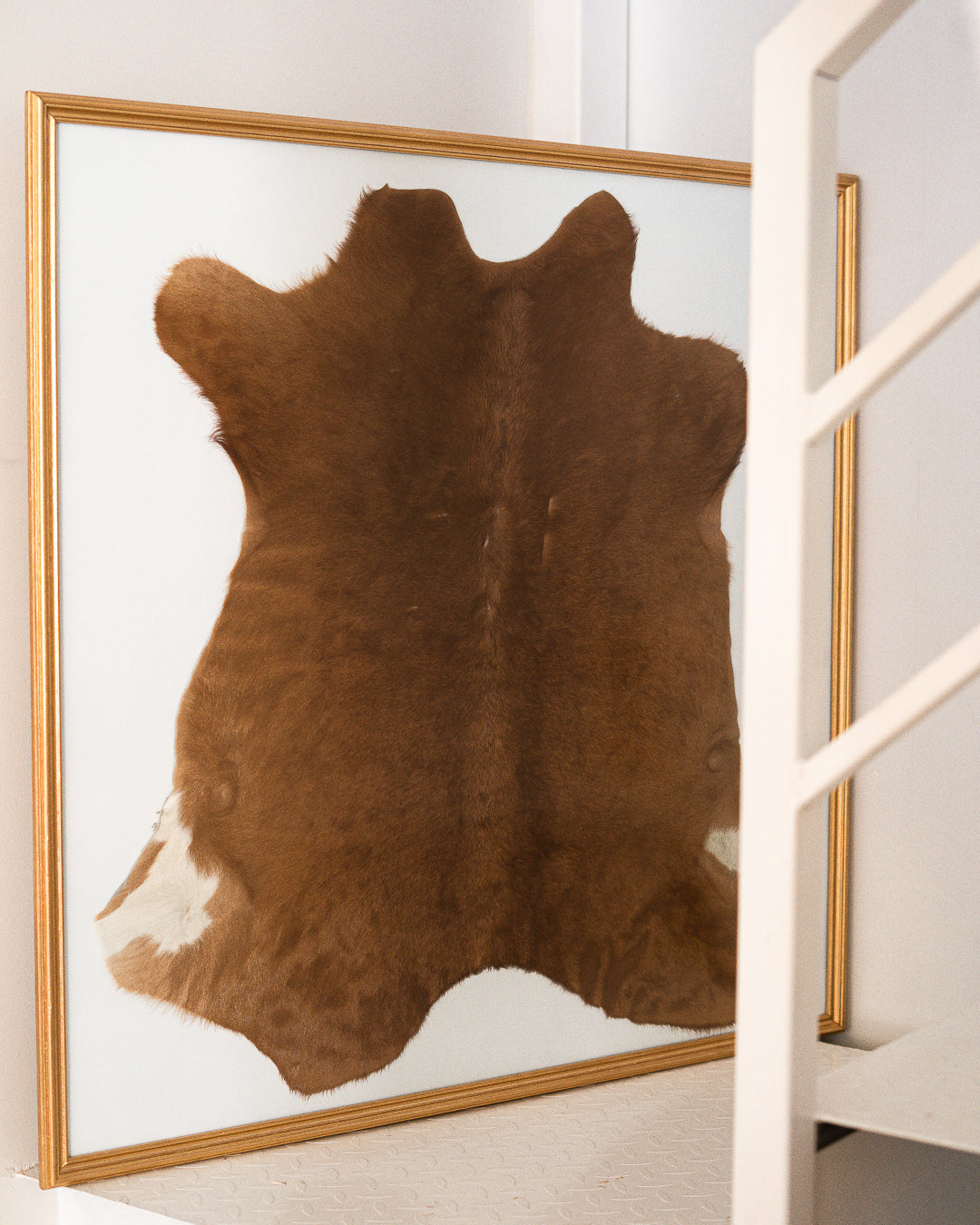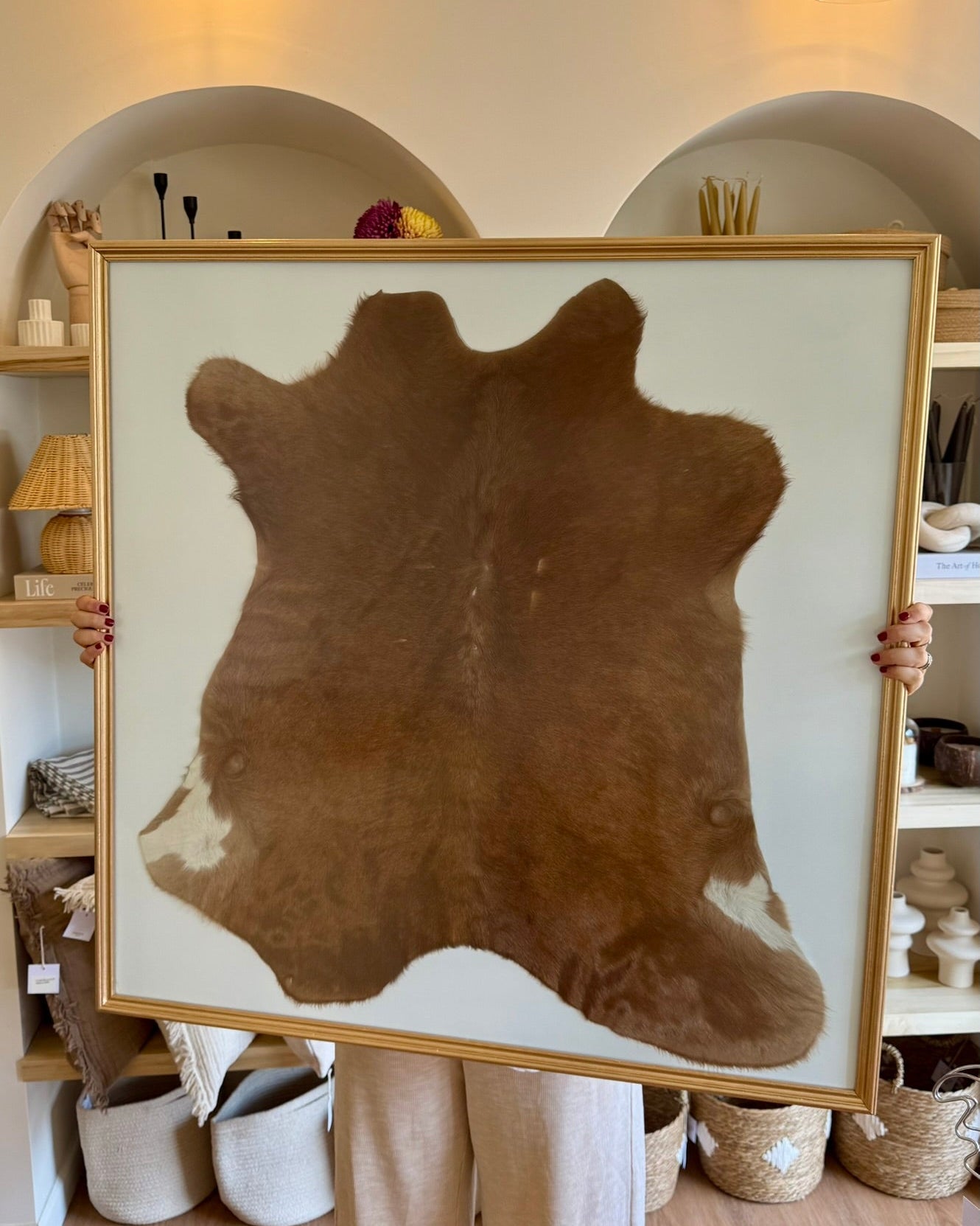 Una pieza protagonista. Este cuadro combina un marco dorado sutil con una auténtica pieza de cuero vacuno, creando un efecto cálido y súper natural. Ideal para sumar textura y carácter.