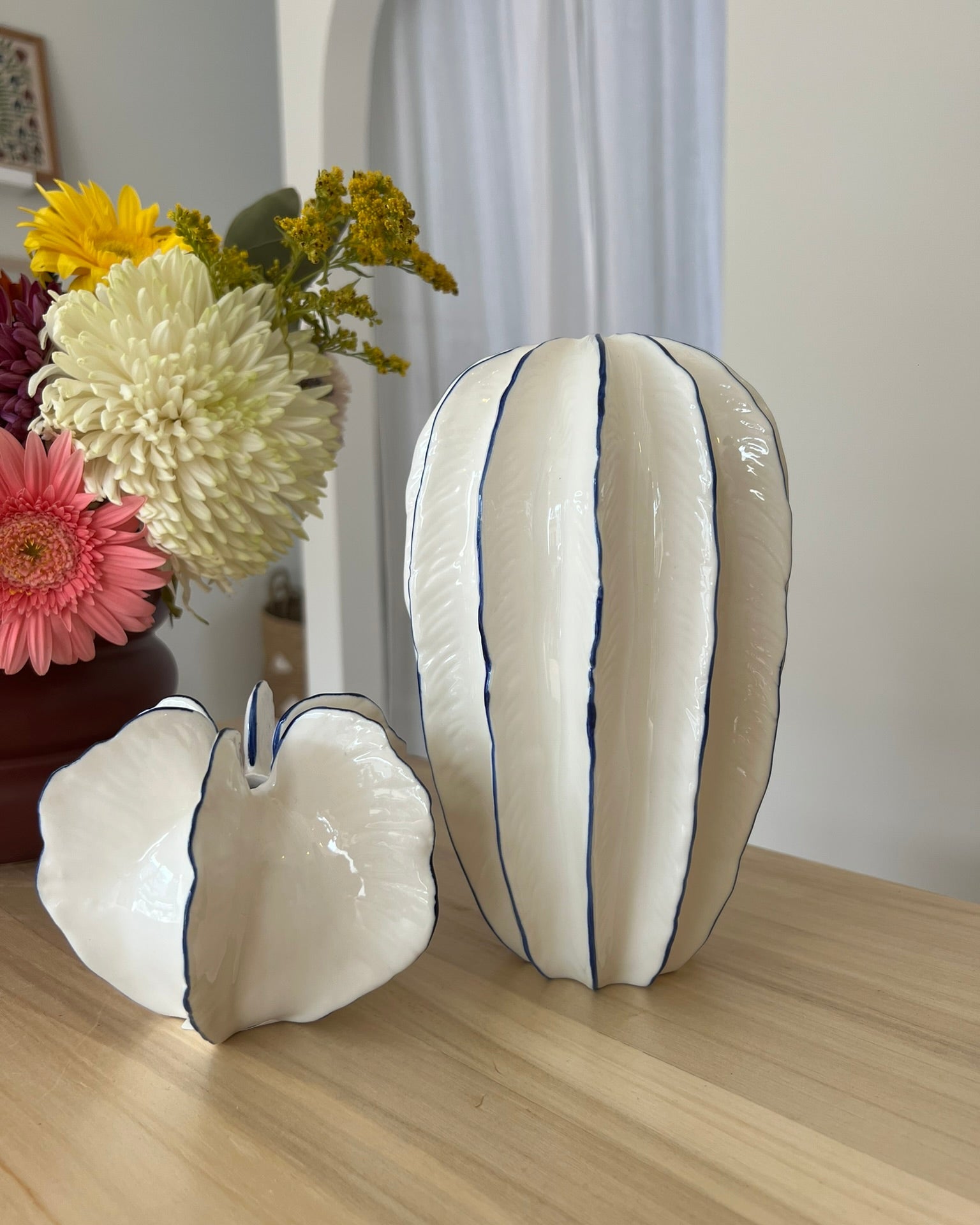 Florero de cerámica artesanal con acabado mate y forma alargada.