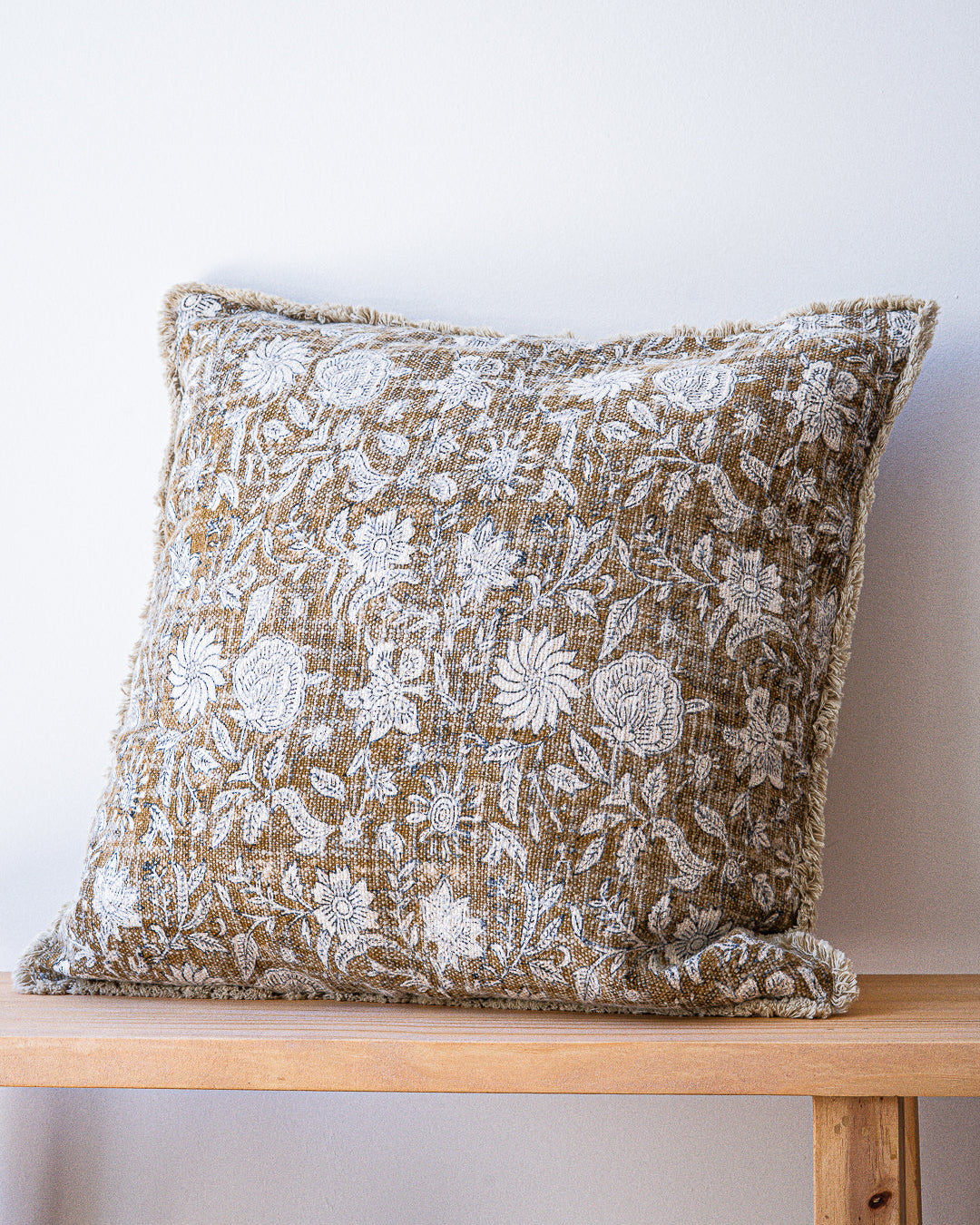 Funda de almohadón en algodón indio, estampada a mano con diseño floral. Cada pieza es única gracias a su proceso artesanal, con textura suave y un estilo cálido que suma carácter al espacio.