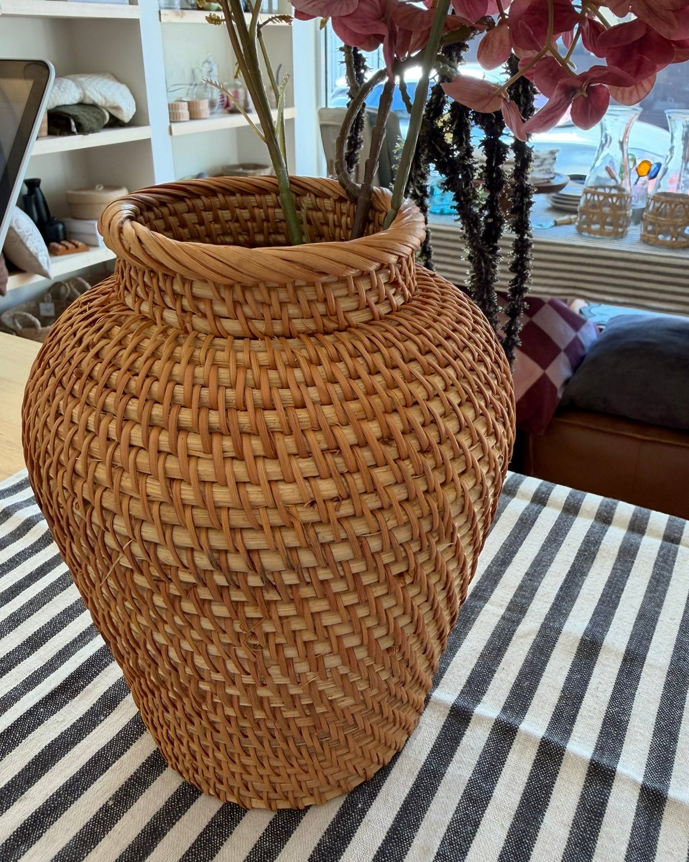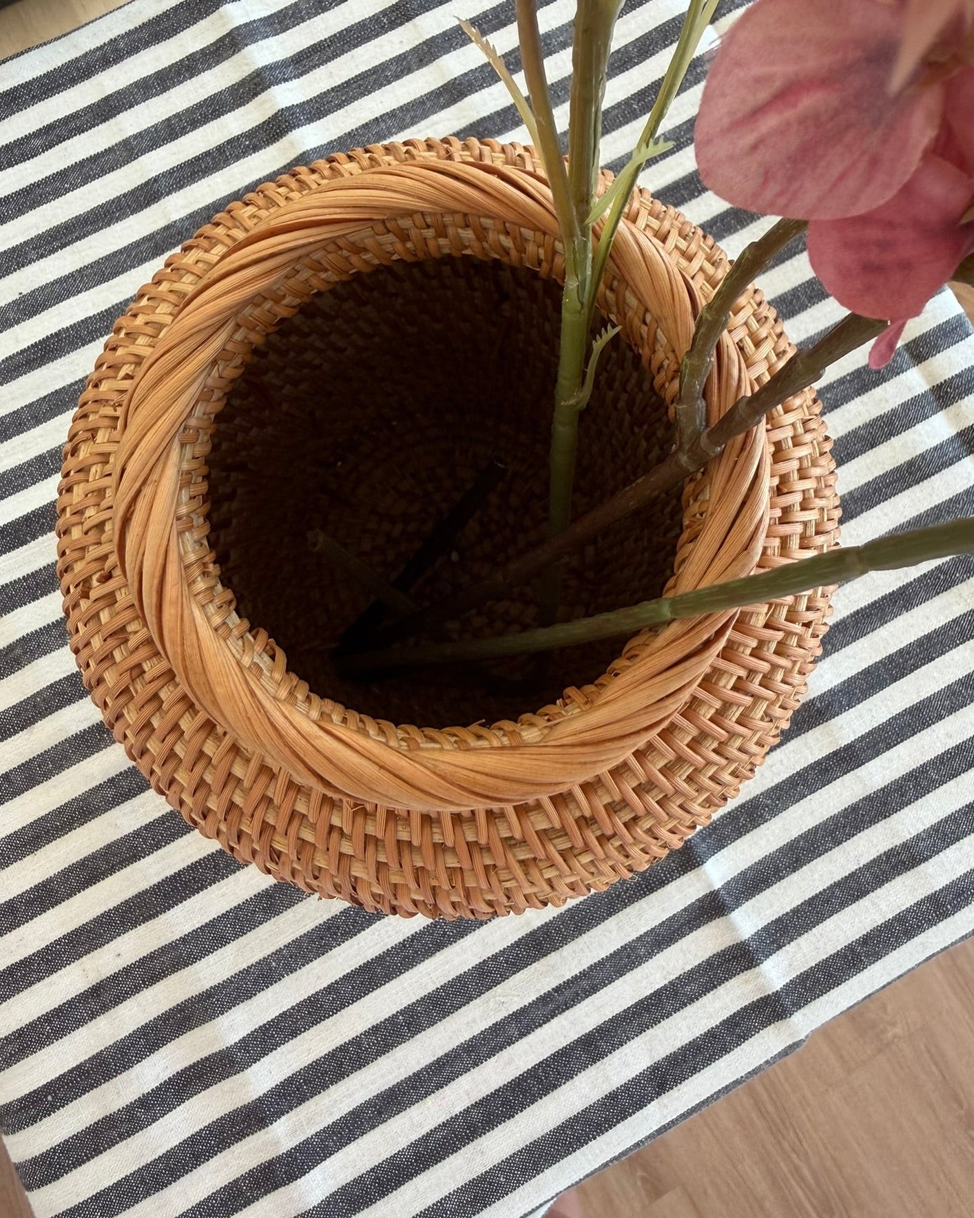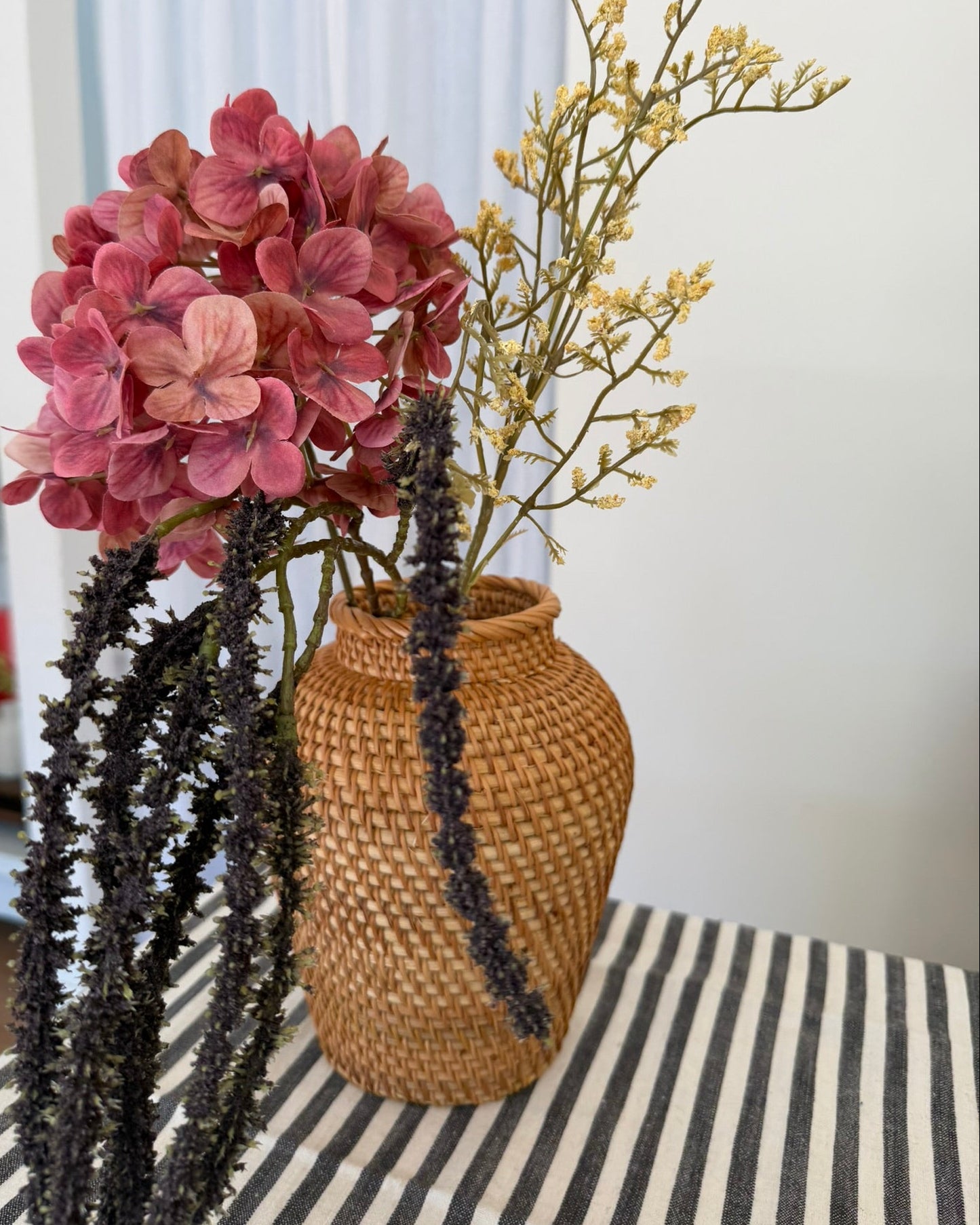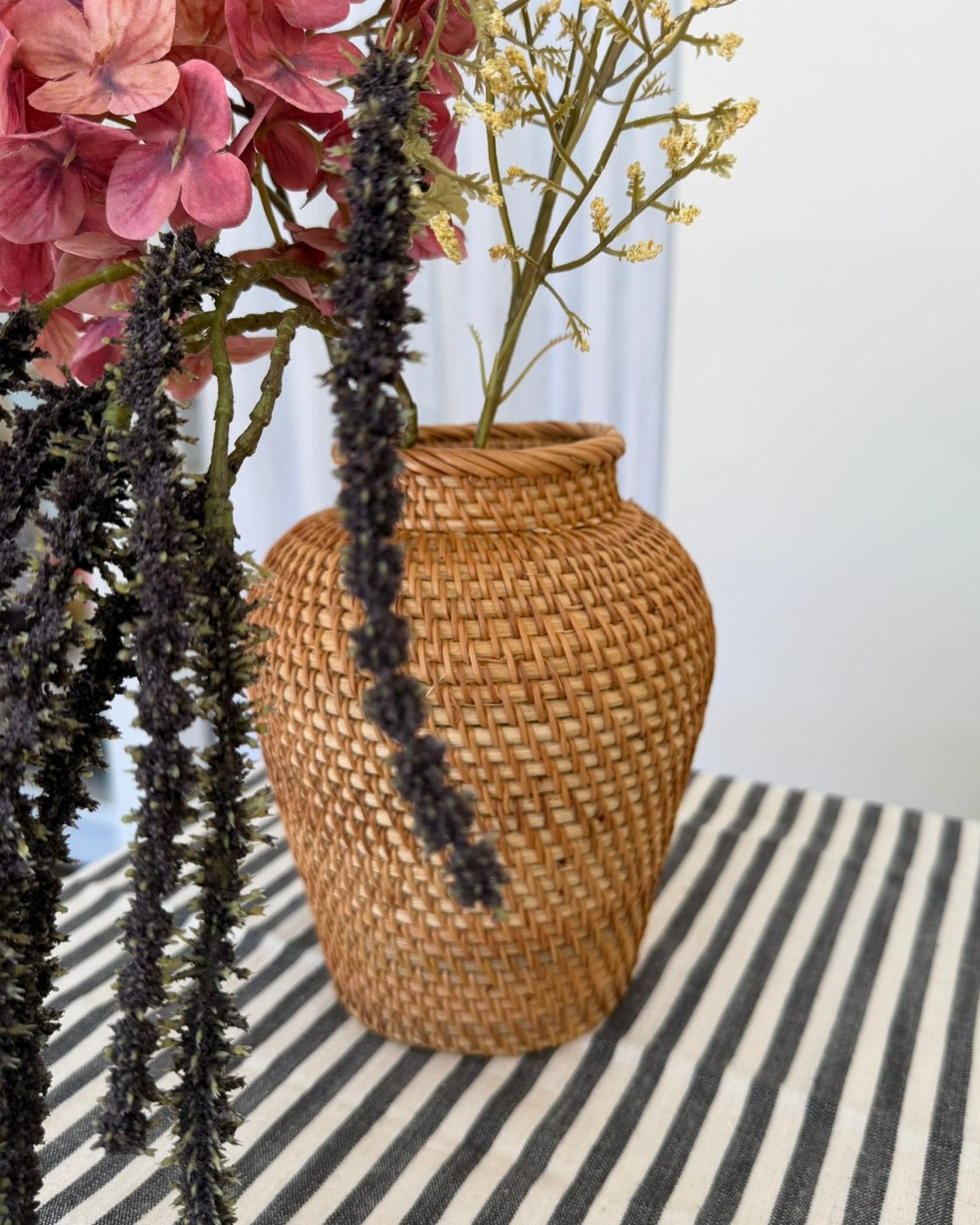 Jarrón decorativo tejido en fibras naturales, de estilo boho–mediterráneo. Aporta calidez y textura a cualquier ambiente. Ideal para flores secas o como pieza protagonista en estanterías y mesas.
