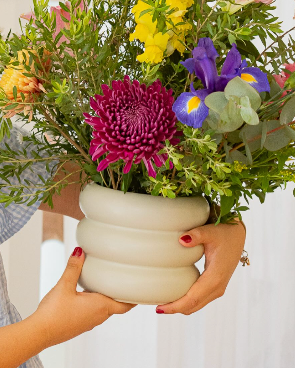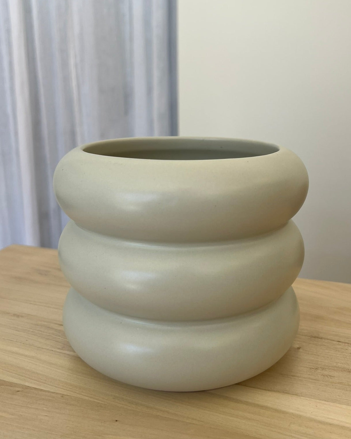 Maceta de cerámica con diseño versátil y líneas suaves. Su forma simple y textura mate la hacen ideal tanto para usar con plantas como florero decorativo.