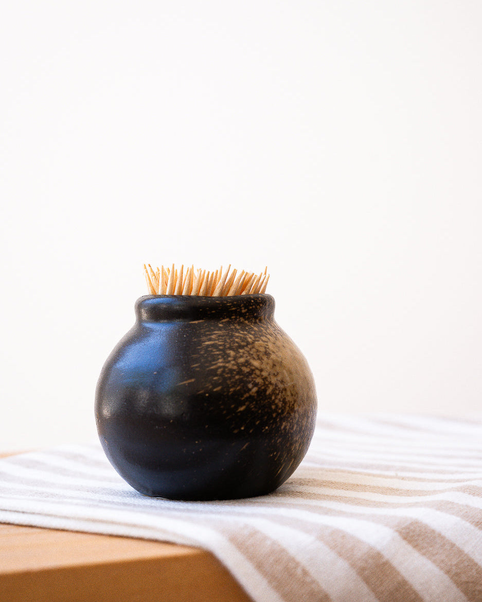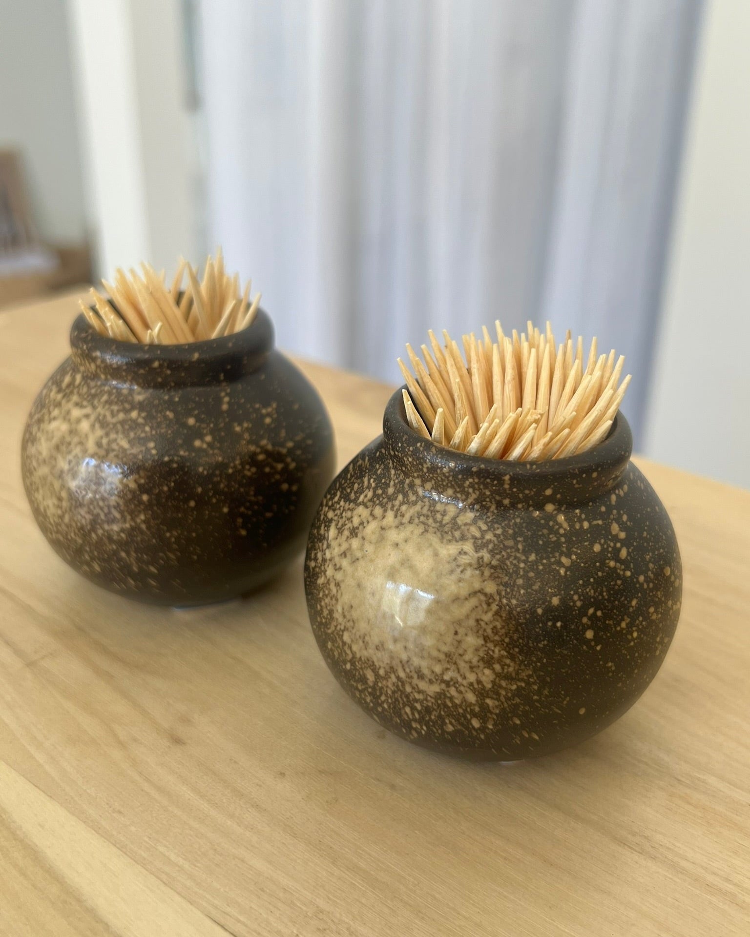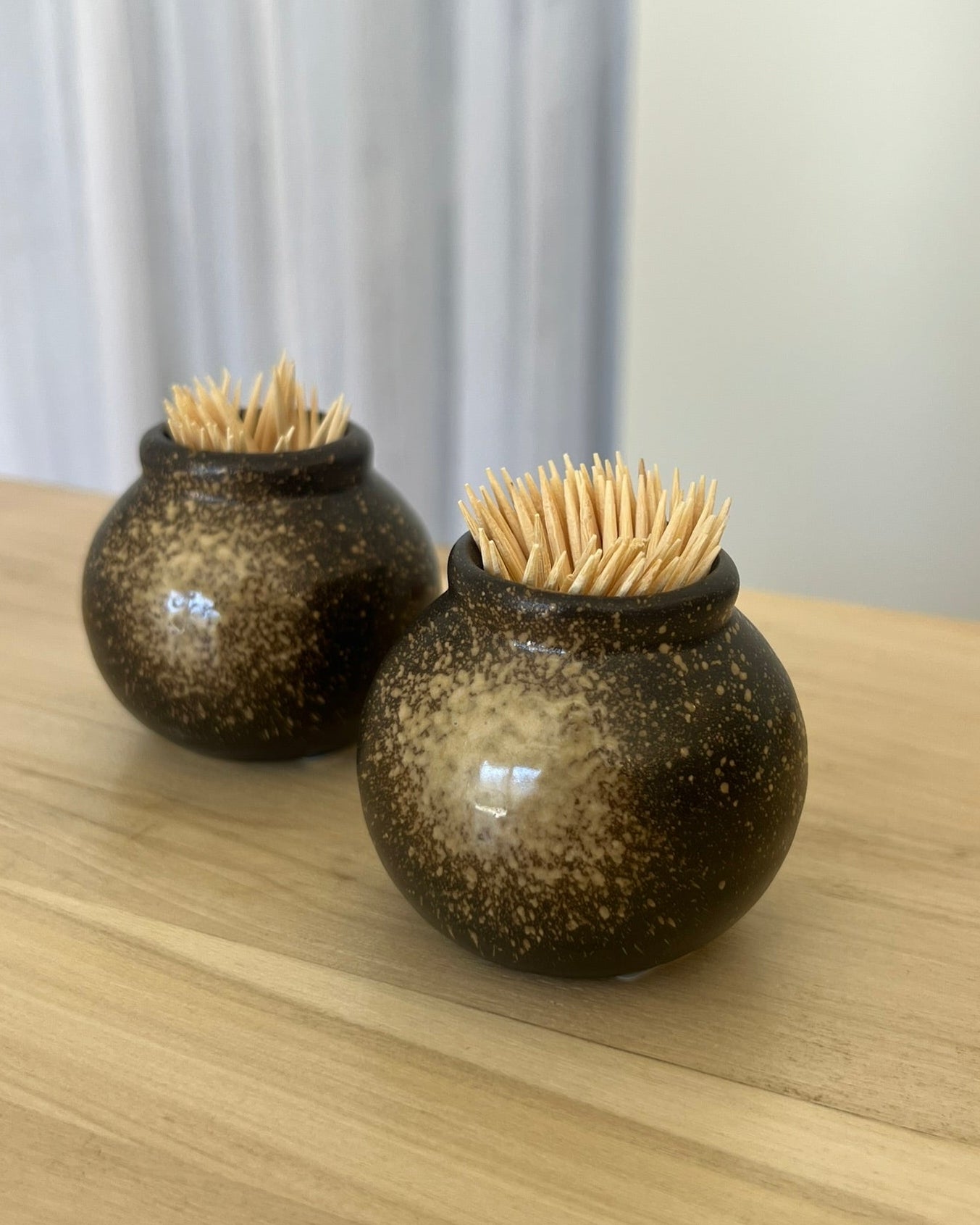 Pequeños detalles que hacen la diferencia. Este porta mondadientes de cerámica artesanal combina textura, color y forma en una pieza única. Ideal para dejar sobre la mesa o la mesada, aporta calidez y estilo a tu cocina o comedor.