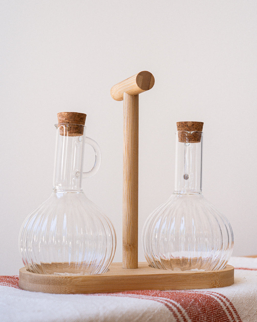 Elegantes, prácticas y pensadas para tener a mano tus aceites y vinagres favoritos. Las botellas de vidrio transparente permiten ver el contenido y la base de madera aporta calidez y orden a la cocina. Quedan divinas sobre la mesada o la mesa, y elevan cualquier rincón con un toque natural y funcional