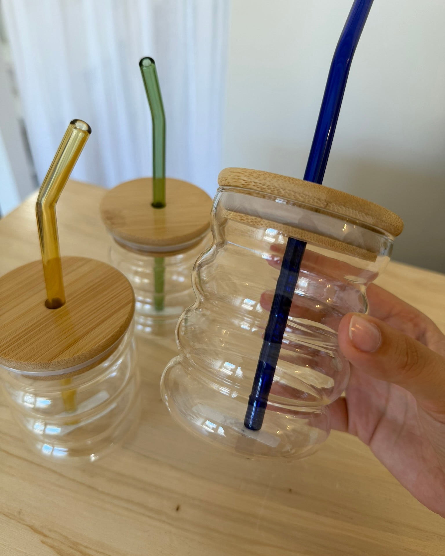 Vasos de vidrio con tapa de bambú y sorbete de color