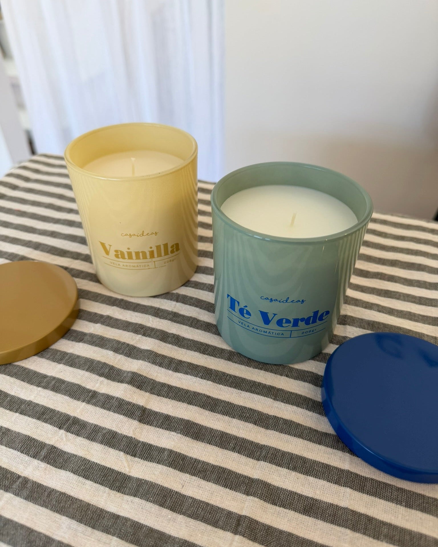 Cada vela viene en un recipiente de colores suaves con tapa a juego, que además de perfumar, decora.